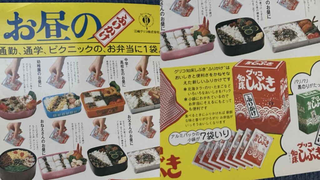 「知床しぶき」は江崎グリコが1970年代初頭に発売したふりかけブランドです。当時の家庭では、ふりかけは弁当や朝食の定番で、各メーカーが競って新商品を出していました。そんな中で「知床しぶき」は、北海道の海の幸をテーマにしたユニークな商品として登場。1980年代後半まで販売が続き、約15年以上にわたり多くの家庭で愛されました。