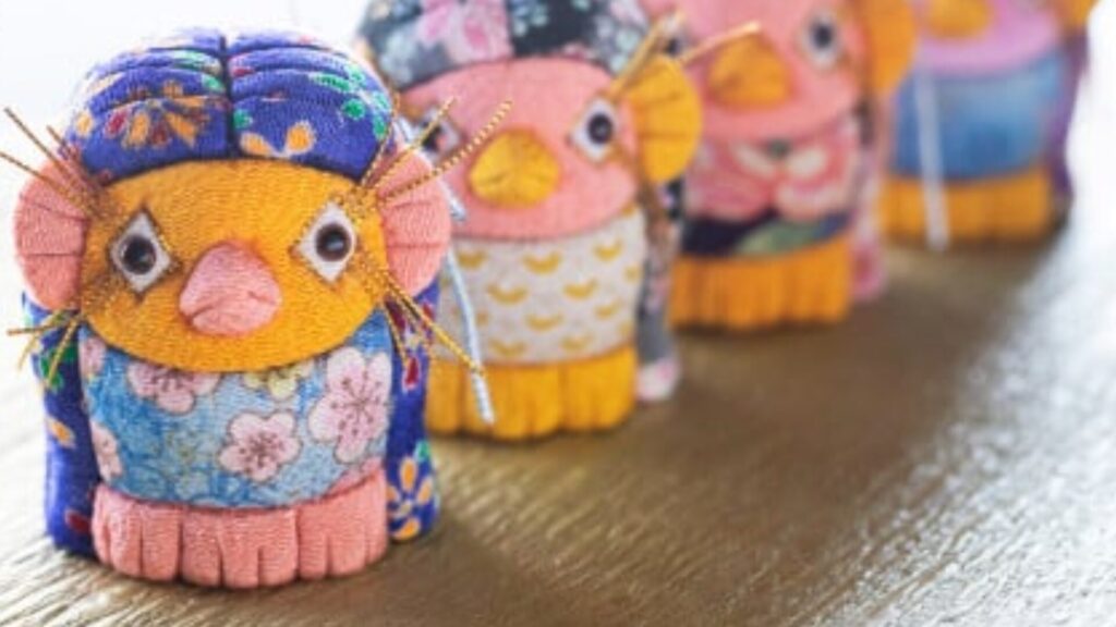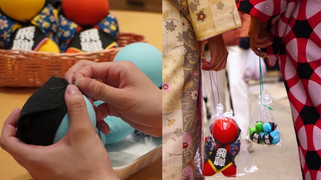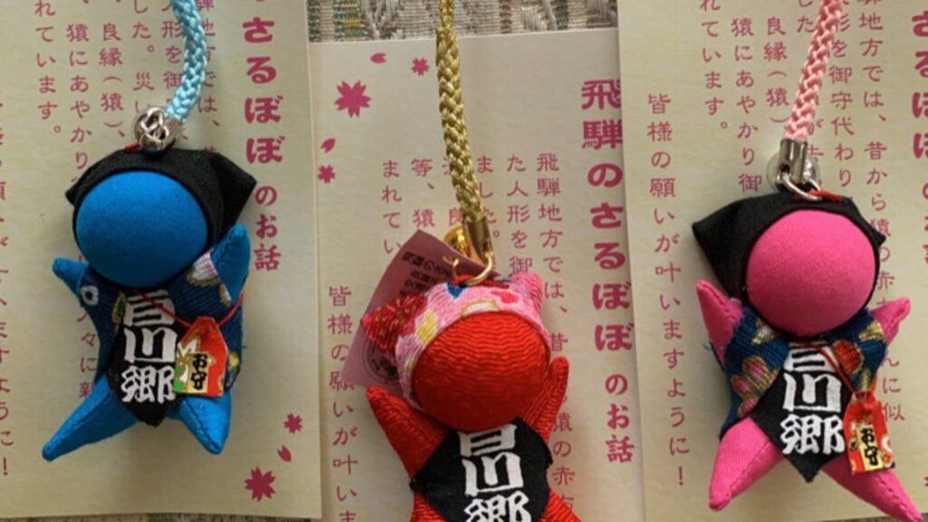 飛騨地方の伝統人形で、健康・縁結び・厄除けのお守り。色ごとに意味があり、赤は健康、青は学業、ピンクは恋愛運などがあります。