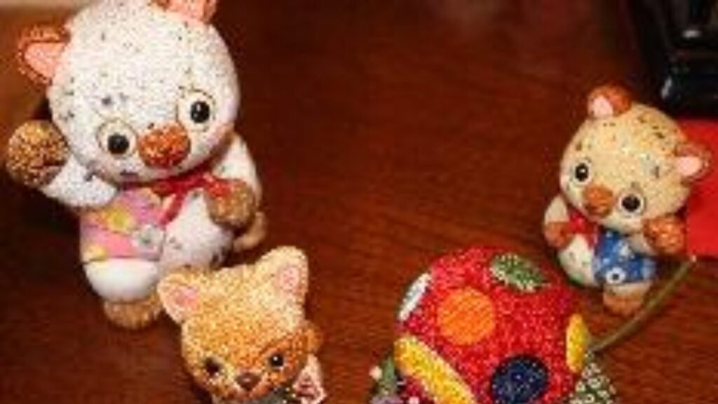 布や糸を使った手作りの小さな人形や動物。四季の花や干支をモチーフにしたものもあり、季節感を楽しめます。