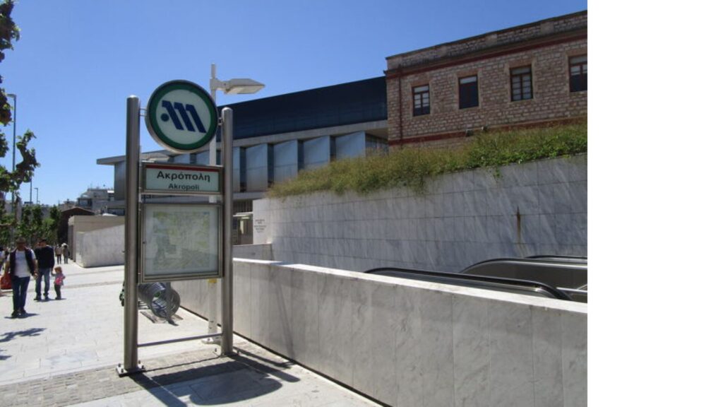 「アクロポリス駅」は、地下鉄1号線(緑色)と3号線(青色)が乗り入れ、空港や主要観光スポットからのアクセスも便利です。駅を出ると案内表示が多く、初めてでも迷わず行けるでしょう。