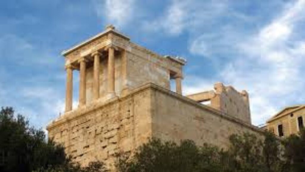 アテナ・ニケ神殿は、紀元前427年から424年にかけて建設され、勝利の女神ニケを祀るための小型のイオニア式神殿です。この神殿は、アクロポリス南西の崖上に位置し、港や海を見下ろす象徴的な場所に建てられました。そのため、防衛の役割も兼ねつつ、軍事的勝利と平和を祈願する特別な意味を持っています。