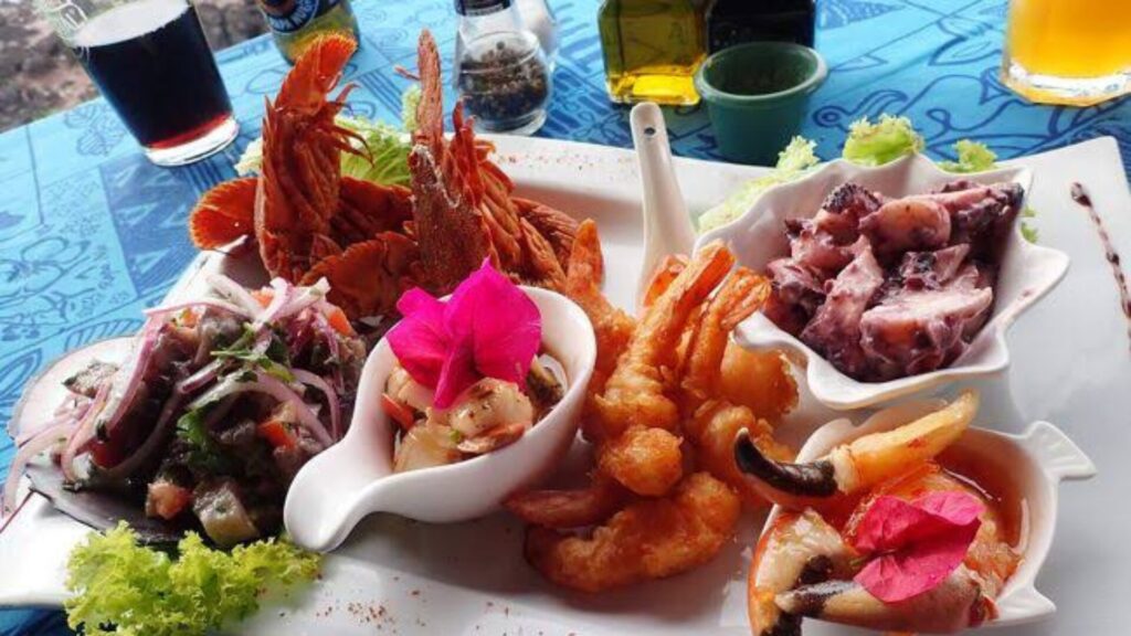 魚介が中心で、特にマグロやロブスターが有名。タロイモやバナナもよく食べられます。観光客向けレストランでは、魚のグリルやシーフードカレーが人気です。