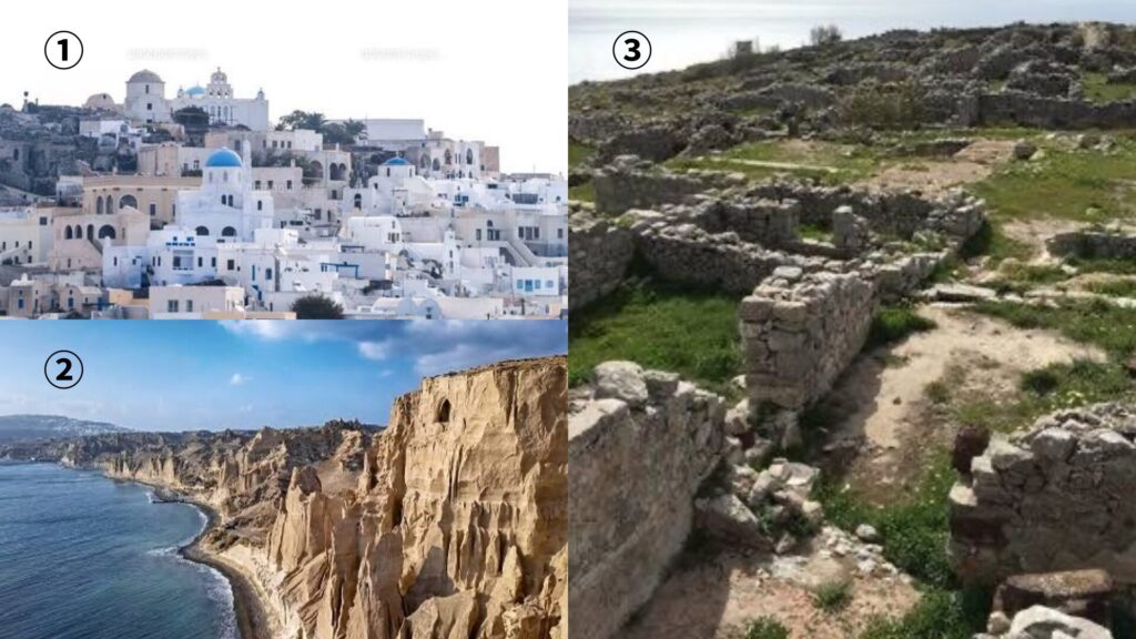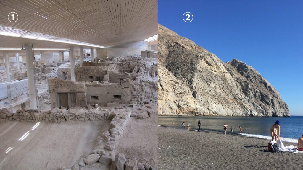 ① Pirgos ② Baxedes beach ③ Ancient Thera