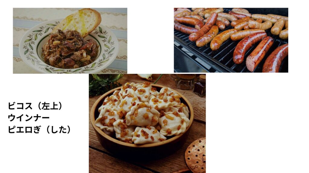 ・ピエロギ(餃子のようなもの)、ウインナー、ビゴス(煮込み料理)が有名。
